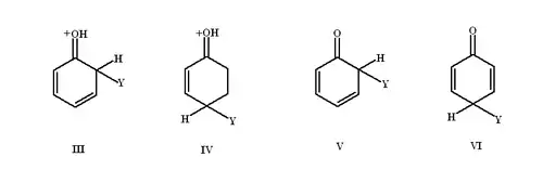 - همانند گروه آمینو، گروه فنلی حلقههای آروماتیک را نسبت به جایگزینی الکتروفیلی قویا فعال میکند و اساساً به همان روش. حالتهای واسطه به ندرت کربوکاتیون هستند بلکه یونهای اکسونیوم (III و IV) میباشندکه در آن هر اتم (البته به جز هیدروژن) دارای یک هشتایی کامل الکترون است. این یونها بسیار سریعتر از کربوکاتیونهای مشتق از خود بنزن تشکیل میشوند. حمله به یون فنوکسید یک واسطه پایدارتری می دهدو سریعتر تشکیل میگردد؛ به آن به مانند یک کتون اشباع نشده نگاه کنید.(V و VI)