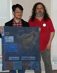 ماتسوموتو و ریچارد استالمن در سال ۲۰۱۲ در جریان اهدا جایزه از طرف بنیاد نرمافزار های آزاد