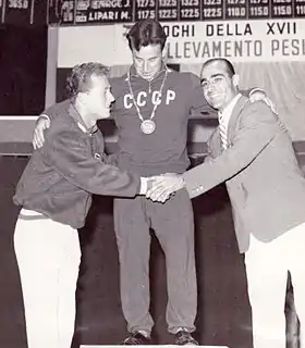 ![]() Isaac Berger, Yevgeny Minayev and Sebastiano Mannironi at the 1960 Olympics | ||||||||||||||||||||||||||||