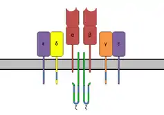 ترکیب گیرنده لنفوسیت تی با زنجیرههای TCR-α و TCR-β (بالا)، ملکولهای فرعی زنجیرهٔ زتا (پائین) و CD3 (نمایشدادهشده بصورت CD3γ ،CD3δ و دو CD3ε ).