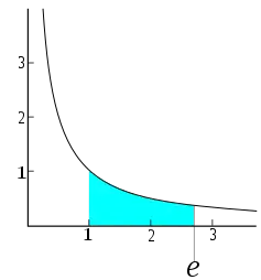 تابع نمایی ، تابع منحصر بفردی است با این خاصیت که برابر با مشتق خود بوده، به گونه ای که مقدار اولیه آن است (و لذا میتوان را به صورت تعریف کرد). لگاریتم طبیعی، یا لگاریتم در پایه ، وارون تابع نمایی طبیعی است. لگاریتم طبیعی عددی چون را میتوان بهطور مستقیم توسط ناحیه زیر نمودار بین و تعریف کرد، در این صورت برابر با مقداری از است که این مساحت را برابر ۱ میکند (تصویر را ببینید). از طرق متعدد دیگری نیز میتوان این عدد را مشخص نمود.