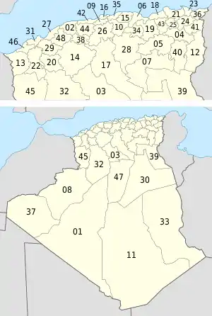 Mappa dell'Algeria divisa in province, ognuna etichettata con la seconda parte del کدها ISO 3166-2.