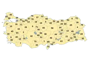 Mappa della Turchia divisa in province, ognuna etichettata con il proprio کدها ISO 3166-2.