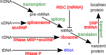 نقشهای RNA غیرکدکننده در دگم مرکزی زیستشناسی مولکولی: ریبونوکلئوپروتئینها به رنگ قرمز، و RNA های غیرکدکننده به رنگ آبی نشان داده شده اند. توجه: snRNA در اسپیلوزوم به کار رفته است.
