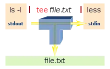 در مثال بالا ابتدا دستور ls لسیت تمام فایلهای موجود در دایرکتوری جاری را چاپ میکند. سپس خروجی خود را به فرمان tee ارسال میکند. فرمان tee هم خروجی دریافت شده هم در خروجی استاندارد (در اینجا صفحه نمایش) و هم در فایلی به نام list.txt ذخیره میکند. اگر فایل list.txt از قبل وجود داشته باشد بر روی آن بازنویسی خواهد شد.