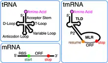 TmRNA یک RNA میباشد که ساختمان ان از دو بخش تشکیل شده:mRNA-tRNA. که معمولاً بخش tRNA به یک امینواسید Ala متصل میباشد. TmRNA در پروکاریوتها هنگامی که رمز پایان وجود نداشته باشد به وجود میآید. هنگامی که طی شرایطی مانند جهش یا شکست در mRNA کدون پایان ان از بین برود، ریبوزوم ترجمه را تا انتهای mRNA ادامه میدهد و در انتهای ۳* متوقف میشود.TmRNA این نوع mRNA که ریبوزوم برروی آنها متوقف شدهاند را شناسایی میکند و به آنها متصل میشود. ریبوزومی که بروی mRNA متوقف شده به دلیل اینکه آخرین ترانسلوکاسیون خود را انجام داده جایگاه A ان خالی میباشد. بخش tRNA مولکول TmRNA وارد جایگاه A میشود و ترجمه ادامه پیدا میکند و از روی mRNA ای که در ساختمان tmRNA وجود دارد، ۱۰ امینواسید به پلی پپتید در حال سنتز اضافه میشود (معمولاً Ala).