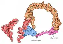 mRNA موجود بروی TmRNA دارای کدون پایان و پس از رسیدن به این ناحیه که بعد از کدشدن 10 aa میرسد، ریبوزوم جدا شده و پپتید تازه سنتز شده رها میگردد. پپتید ناقص بوده و باید ازبین برود. ۱۰ امینواسید روی پلی پپتید ناقص به عنوان یک Tag برای آنزیمهای پروتئاز عمل مینماید که آنها را برای هیدرولیز راهنمایی کند. در پروکاریوتها انواع مختلفی از tmRNA هست که با مکانیزم مشابهی عمل میکند.TmRNA شرح داده شده تحت عنوان RNA10sa نامیده میشود.[1][2][3]
